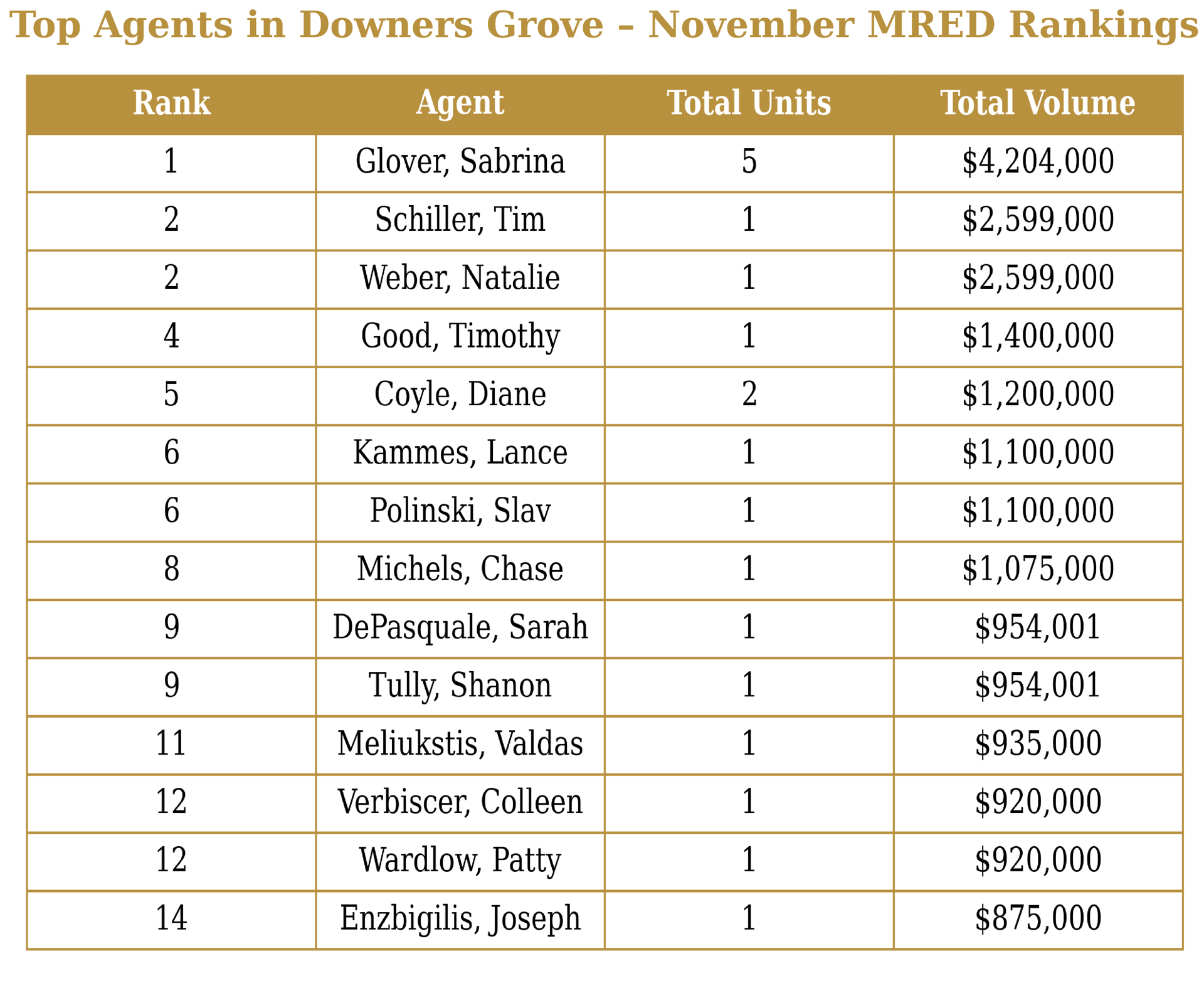 According to the most recent MRED MLS report, these agents led the Downers Grove market in closed volume for November:
